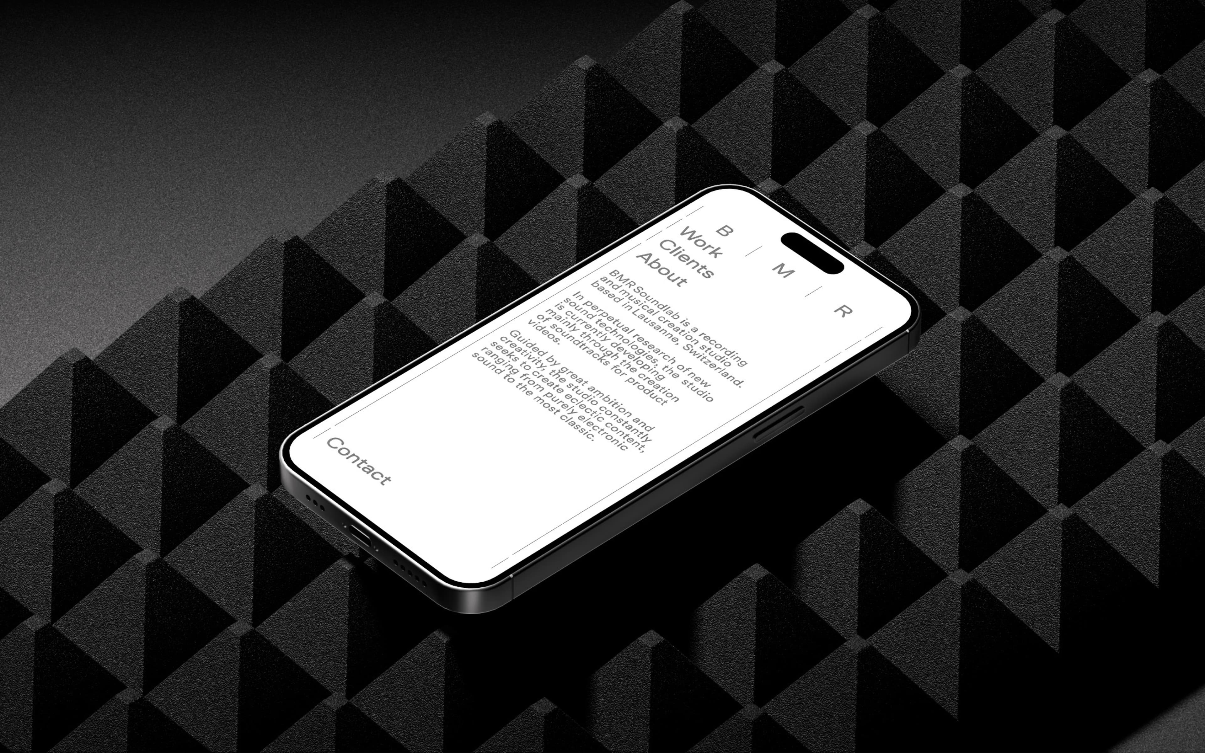 BMR Soundlab is a sound design studio based in Lausanne, founded by Basile Merlin Rapit. Devoid of an existing visual identity and other communication materials, the client approached our agency solely to develop a website design. Our challenge, in the absence of a logo, was to focus on developing an identity rather than a traditional logo, and to create a responsive system rather than a static identity. The design approach aimed for minimalism, incorporating simple construction elements such as lines, reminiscent of musical staff lines and guitar strings. These lines serve to structure the website's content, arranging text and images into three columns.